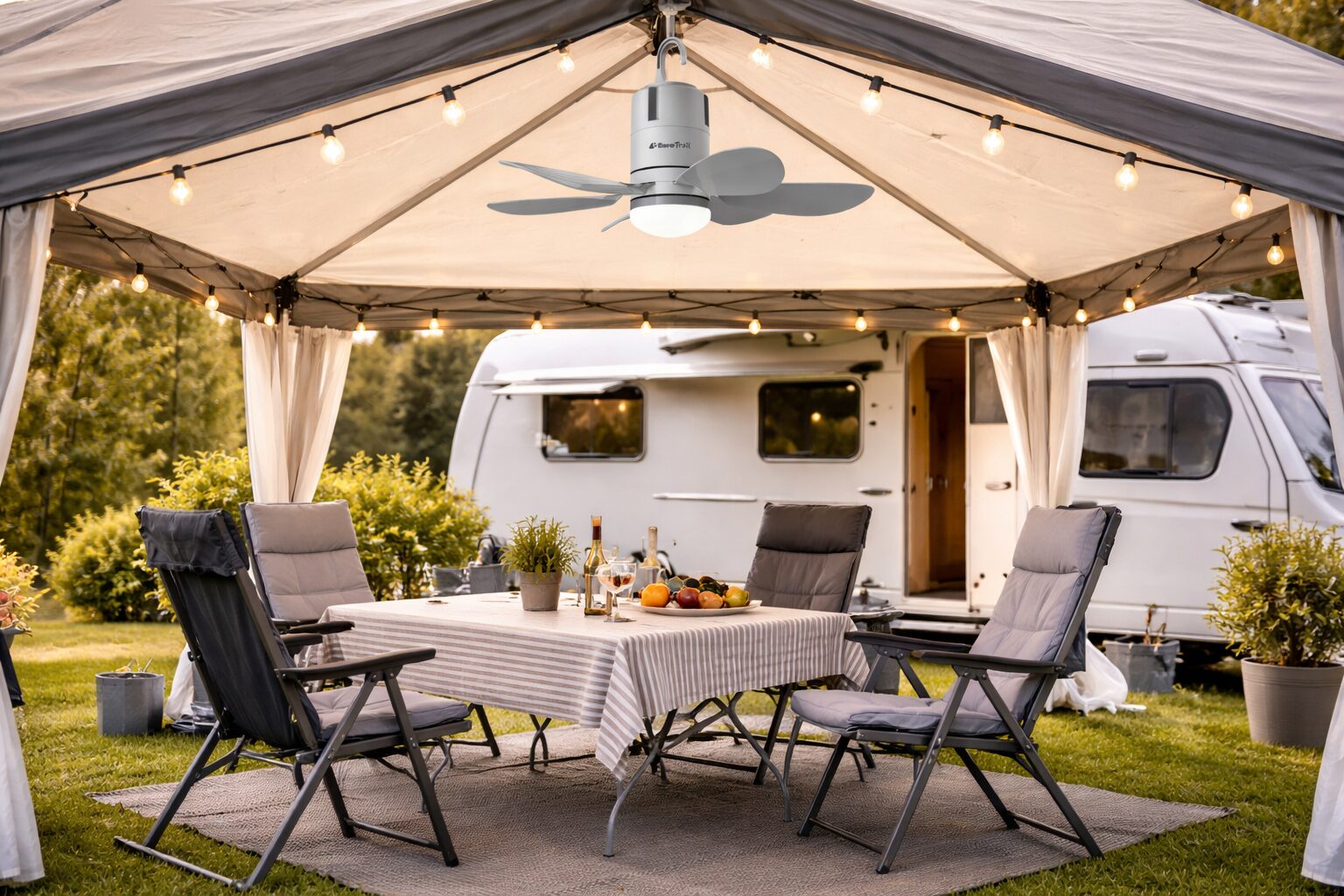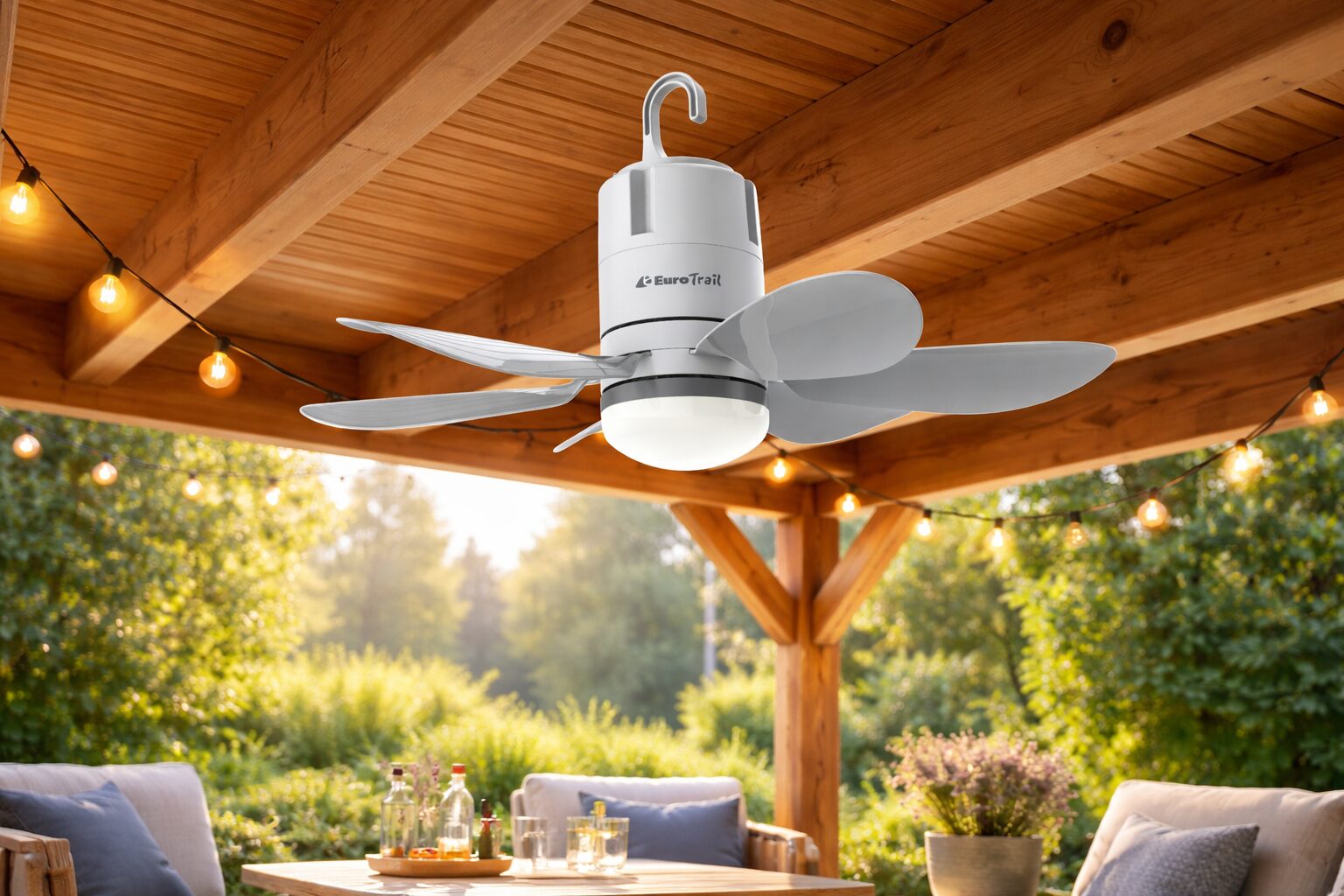 Deze praktische oplaadbare plafondventilator is ideaal voor gebruik in de voortent, onder de luifel of op de veranda. Dankzij de afneembare bladen is hij compact op te bergen en gemakkelijk mee te nemen — perfect voor kampeerders en buitenliefhebbers.