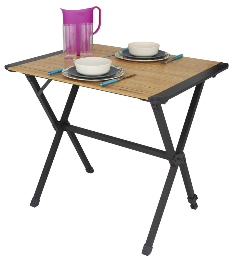 Tafel met aluminium frame en bamboe top. Het stevige aluminium frame wordt geleverd met een extra stabilisatiestang tussen de poten die voor extra stabiliteit zorgt. De topplaat is gemaakt van trendy waterdicht bamboemateriaal. De tafel is eenvoudig uit elkaar te halen en op te vouwen tot een klein pakketje met een klein pakvolume. Verstelbare poot, incl. draagtas. Kleur: antraciet met bamboe.