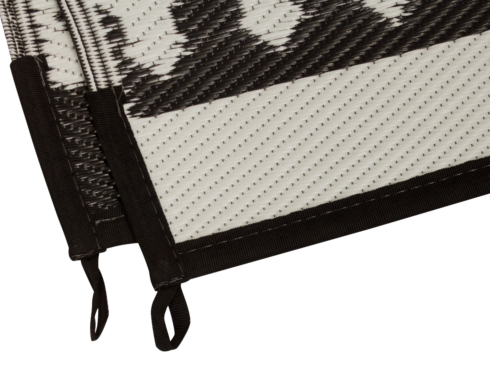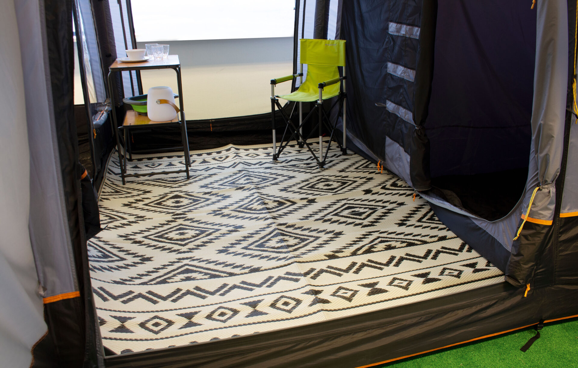 De Patiomat biedt extra comfort en bescherming voor gebruik op de camping in de luifel of voortent maar ook ideaal voor op het strand en om of in het huis. Kleur: zwart/antraciet en in een inca design wit/zwart (reversable), inclusief opbergtas.